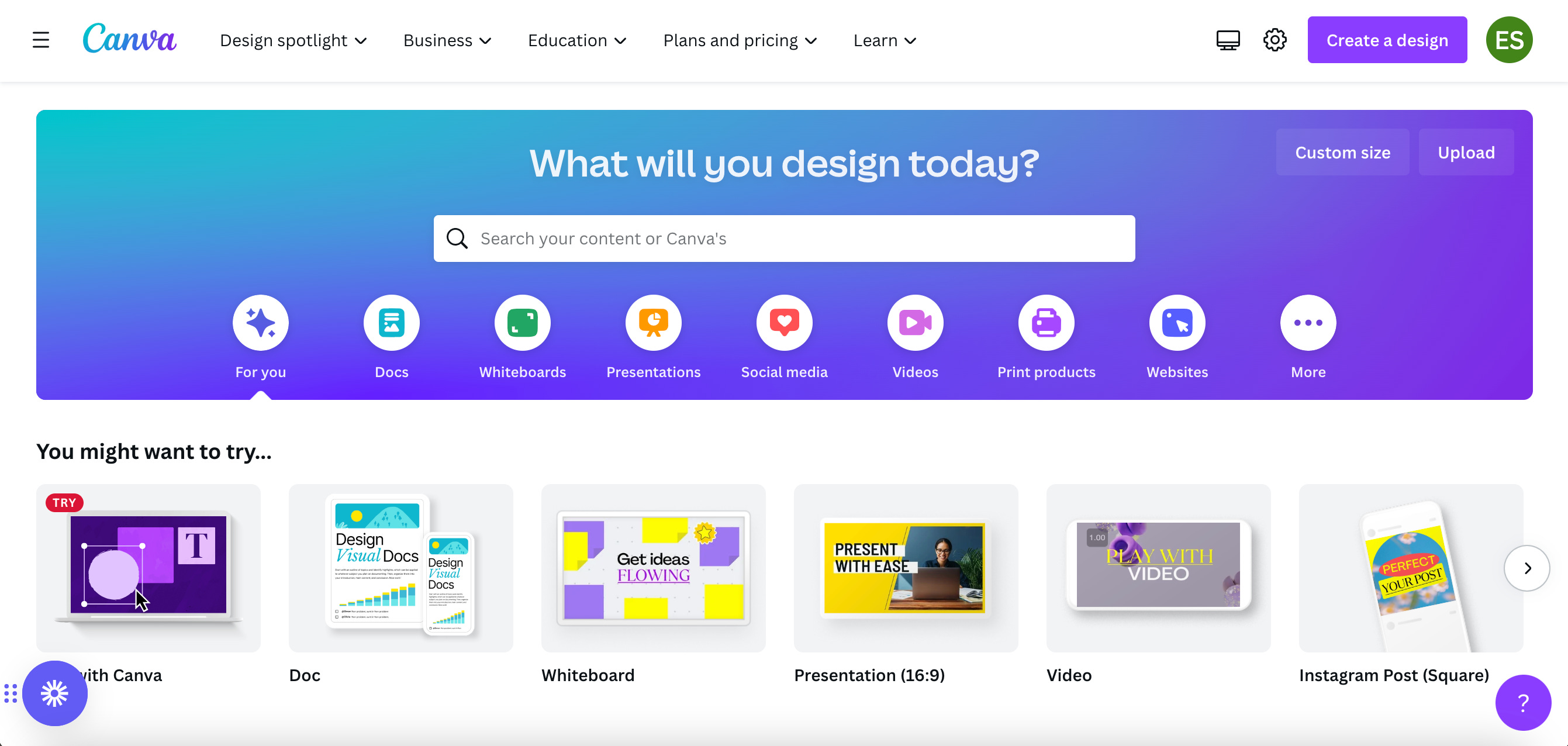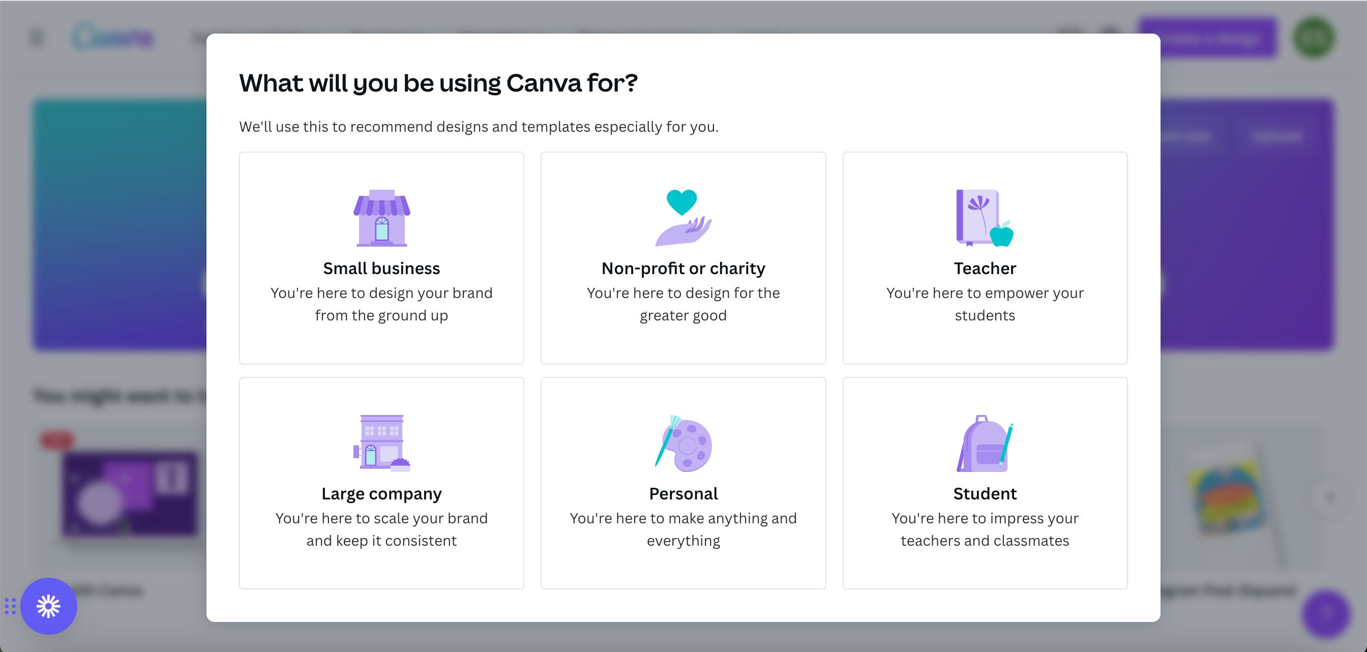 There are a lot of different use cases for Canva. In the setup, they seek to understand what the user wants to accomplish.