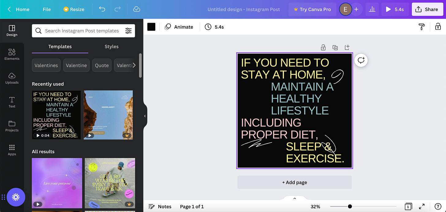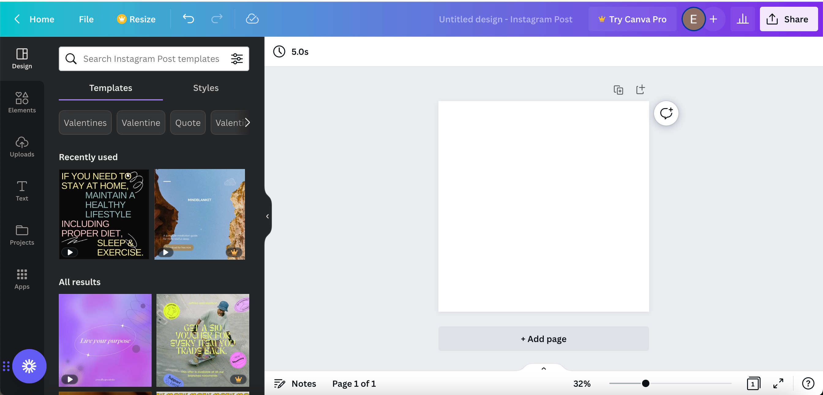 The setup actually continues. When a type of post is clicked, a project is created. The user is taken to the main workspace. In this workspace, Canva has proposed templates relevant to the project type.